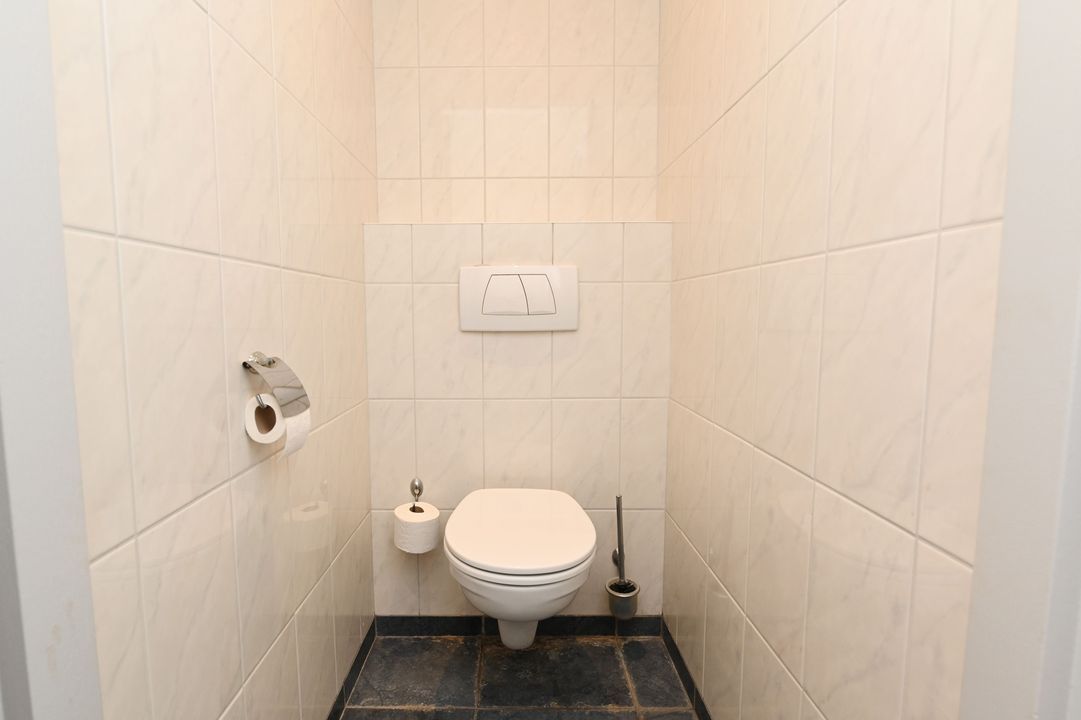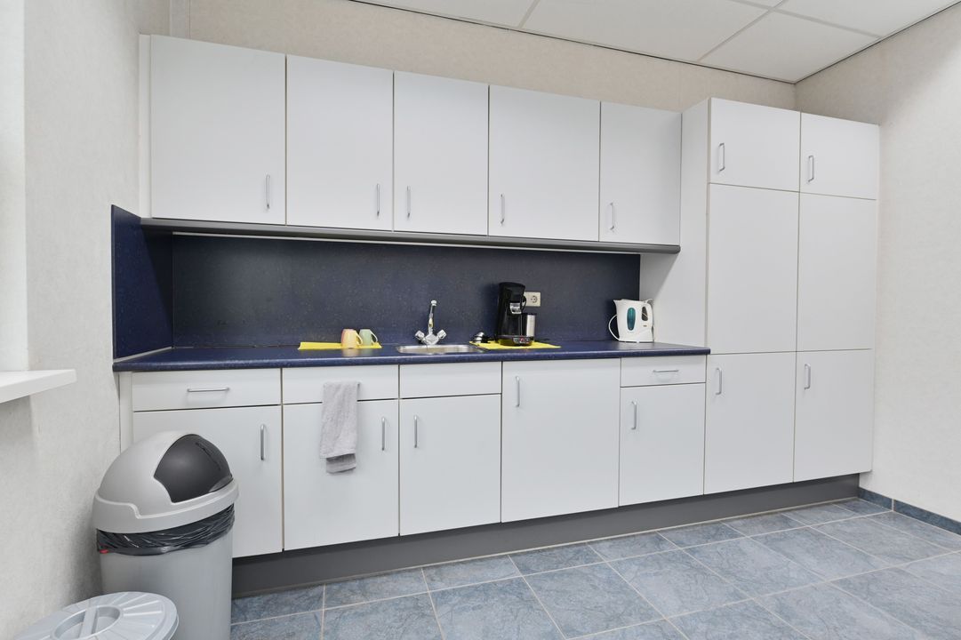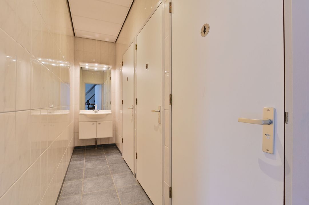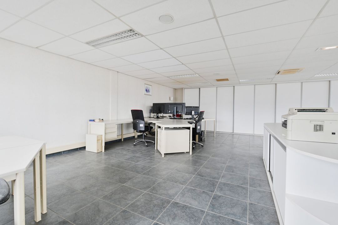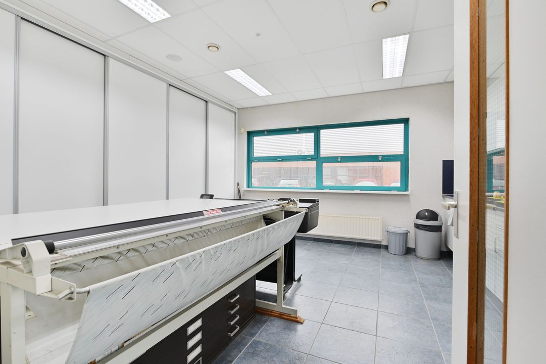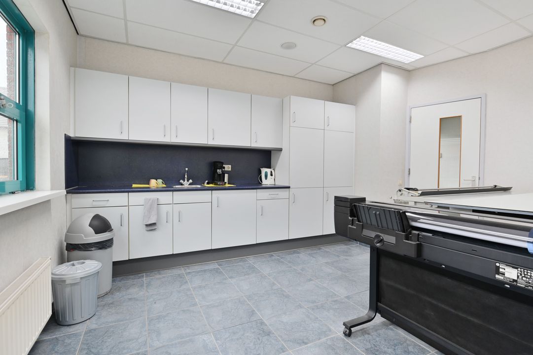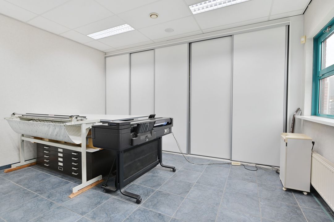 Via een vaste trap bereikt u de eerste verdieping. Deze verdieping is dankzij raampartijen aan beide zijden zeer licht en biedt diverse gebruiksmogelijkheden, bijvoorbeeld als kantoor- of opslagruimte. De verdieping is voorzien van een systeemplafond met verlichting, vaste kastruimte en verwarming en airco.