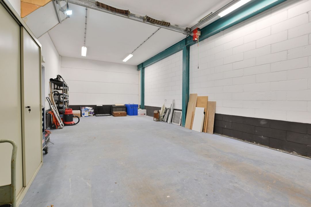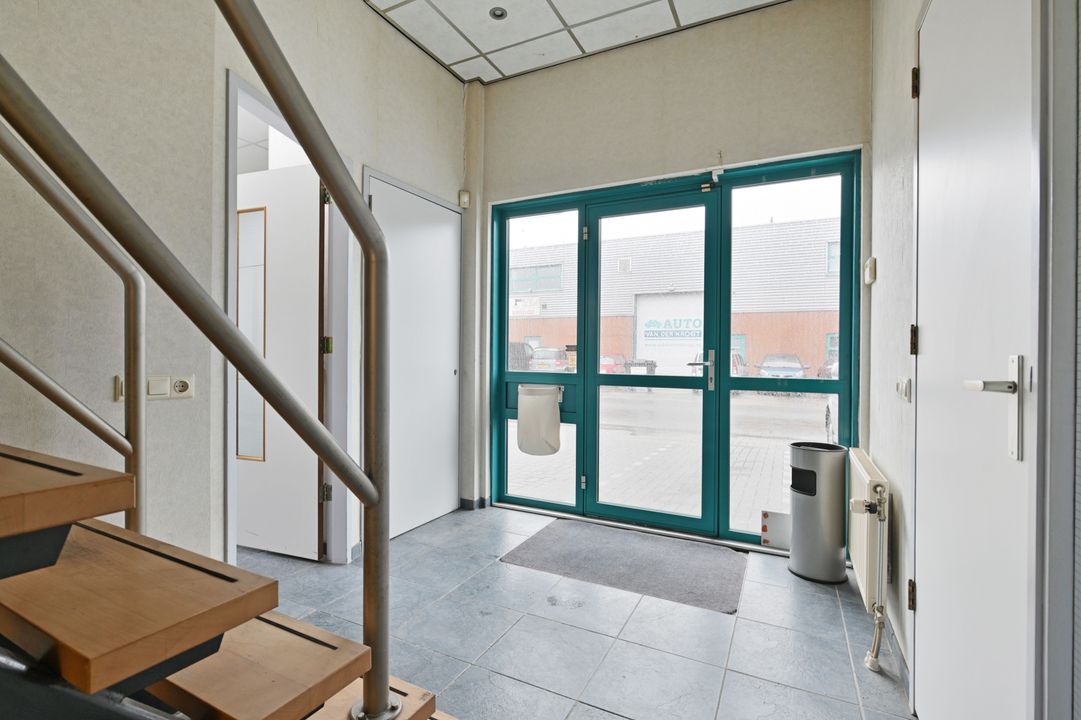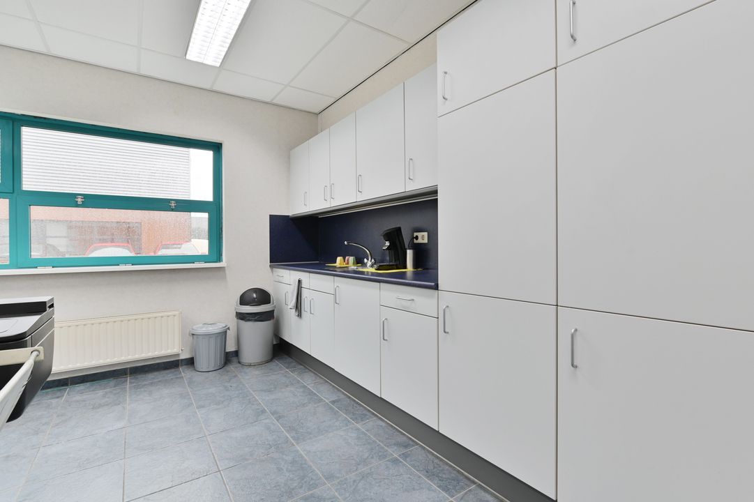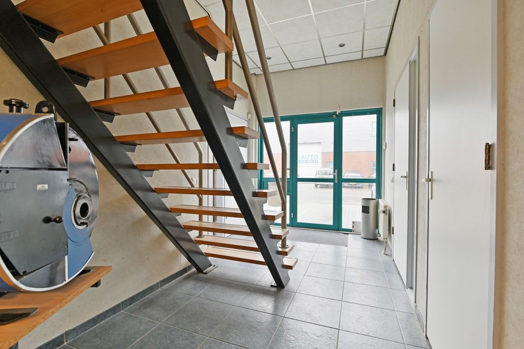 Entree via loopdeur en overheaddeur. De begane grond beschikt over een kantine met keukenopstelling en een kantoorruimte, beide voorzien van een systeemplafond en radiatoren. Tevens zijn er uitgebreide sanitaire voorzieningen aanwezig, waaronder twee toiletten, een urinoir, douche en wastafel. De bedrijfsruimte is voorzien van verlichting, cv-ketel en een omvormer ten behoeve van de zonnepanelen.