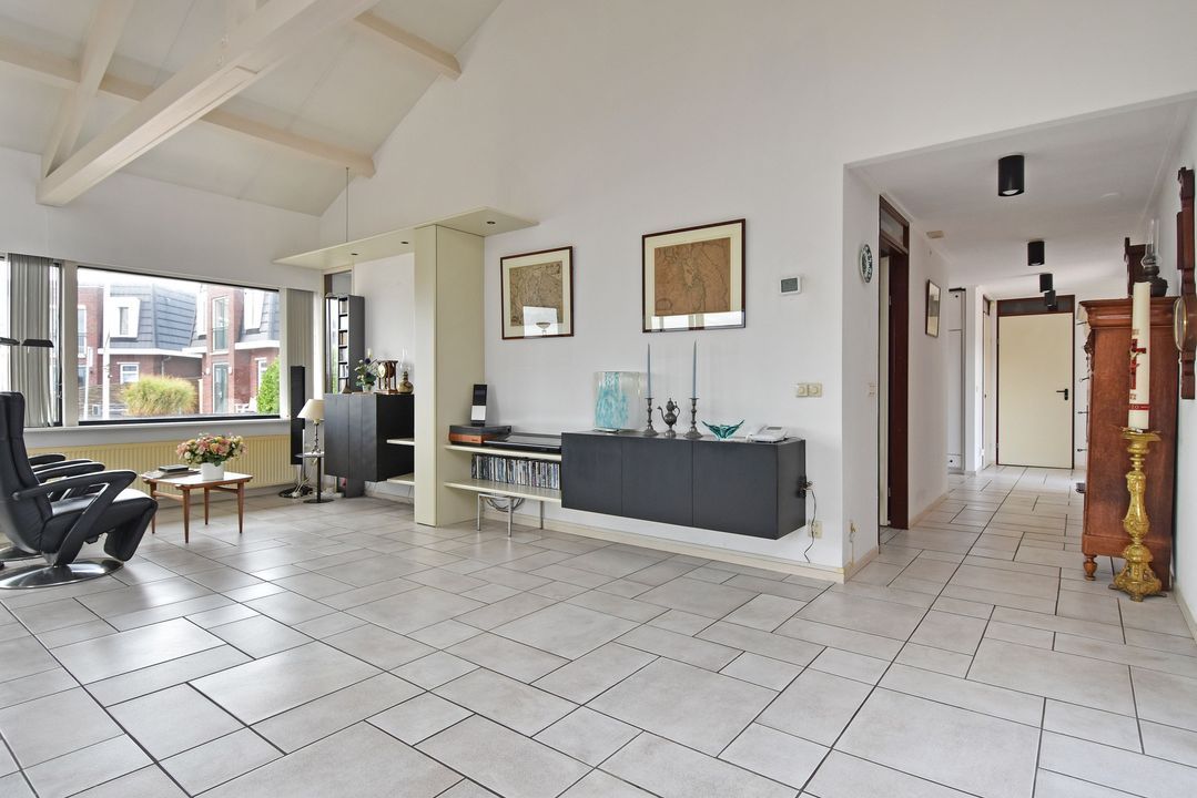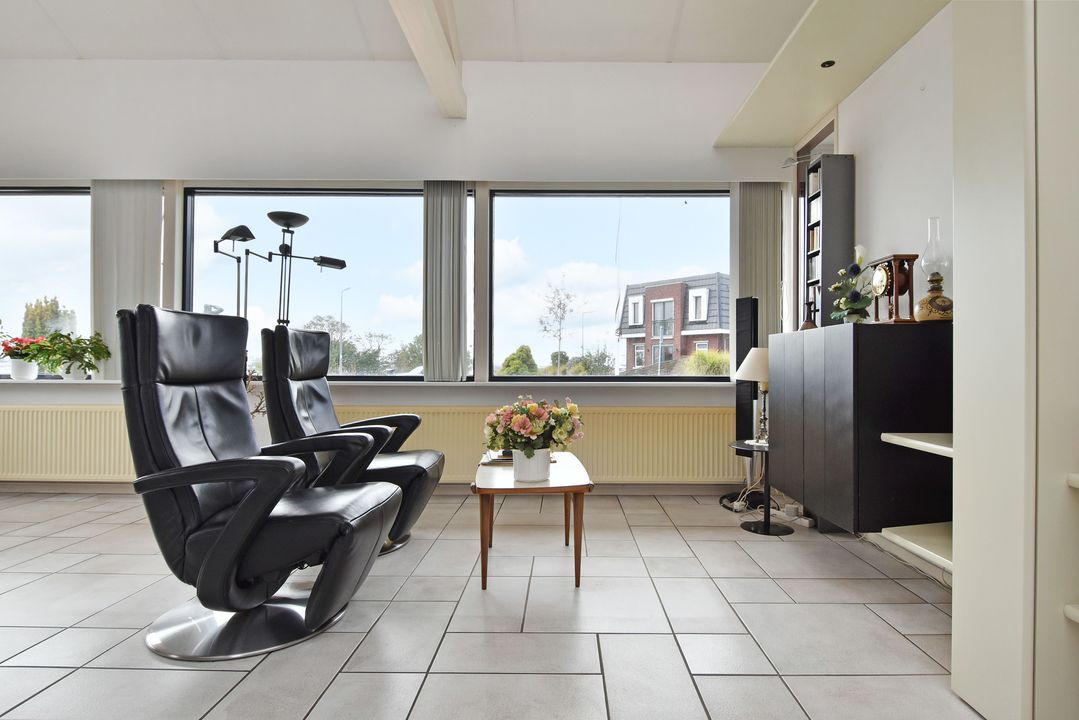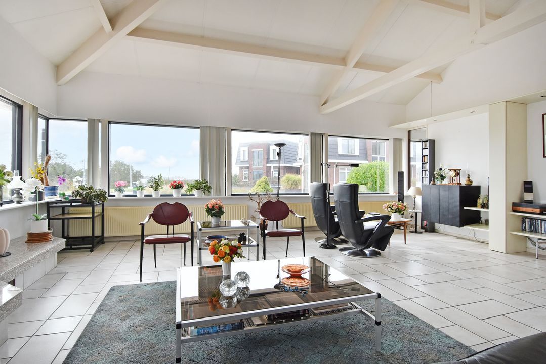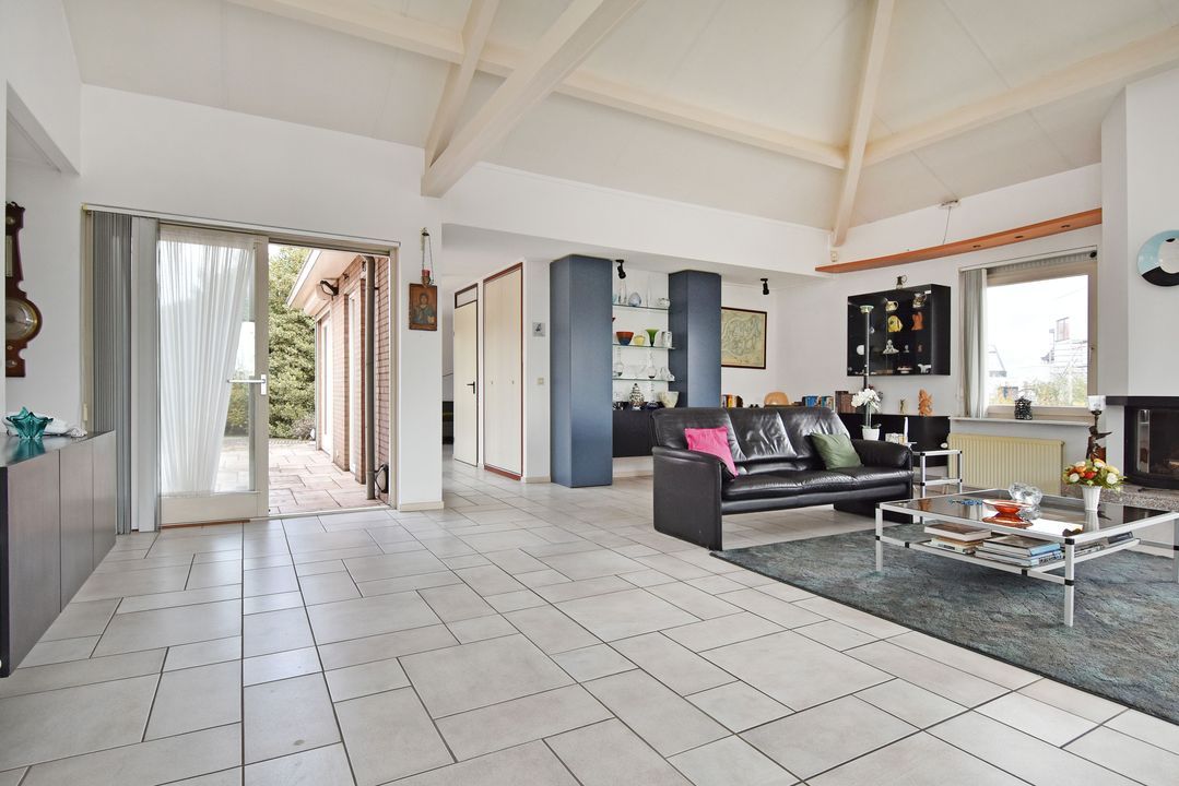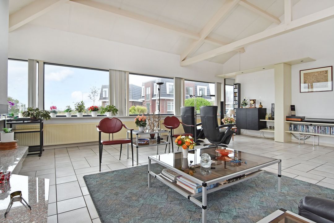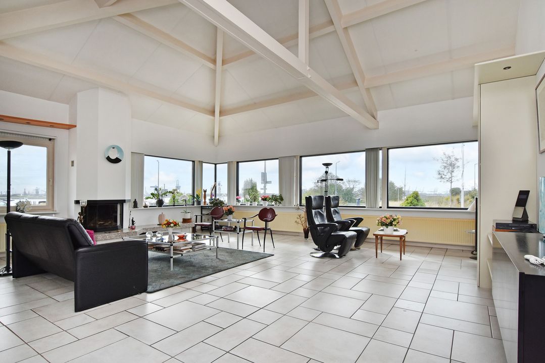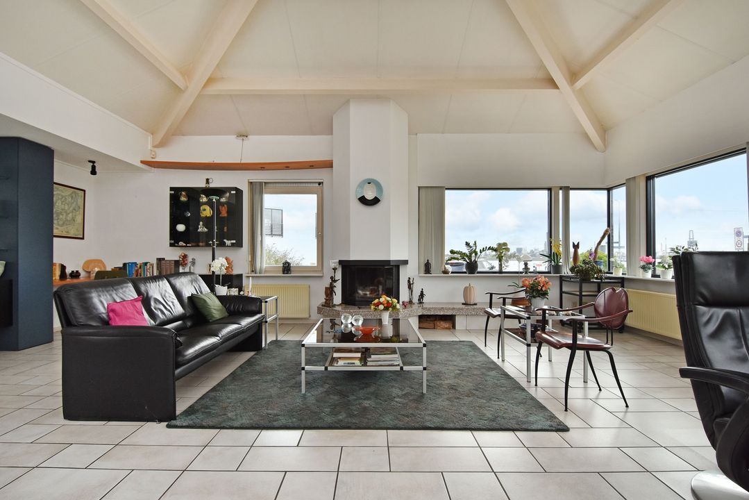 De royale woonkamer is een heerlijke leefruimte met een sfeervolle open haard, keramische vloertegels, een indrukwekkende nokhoogte van 4,55 meter en grote raampartijen die zorgen voor een overvloed aan daglicht én een panoramisch uitzicht op de haven en de scheepvaart op de Nieuwe Waterweg.