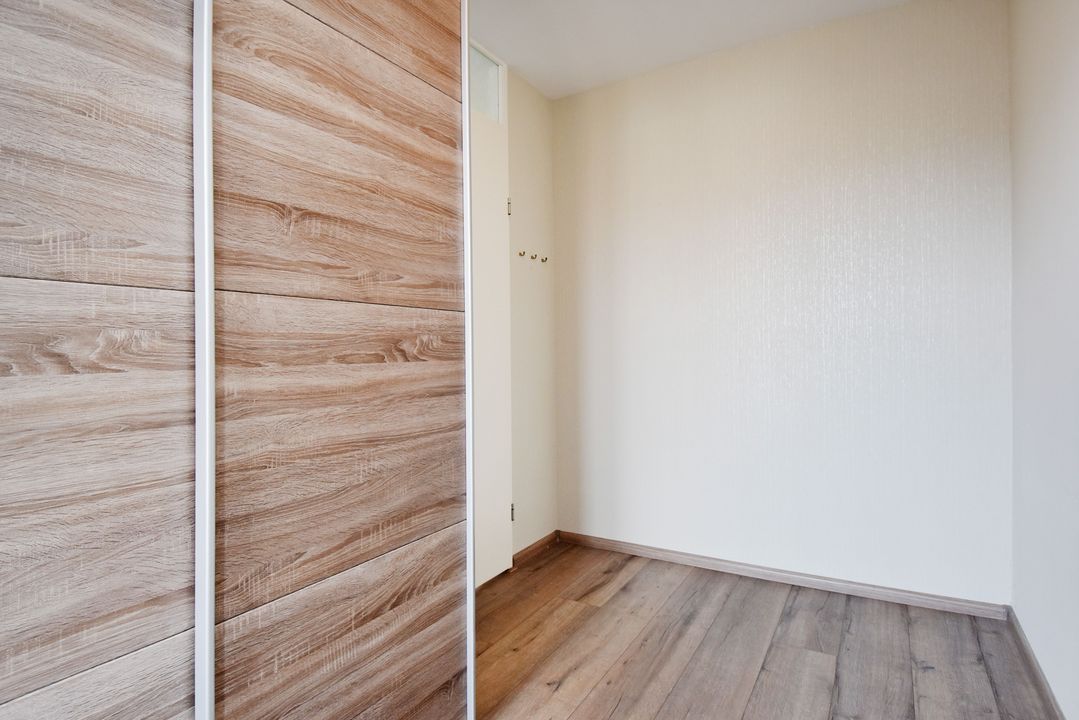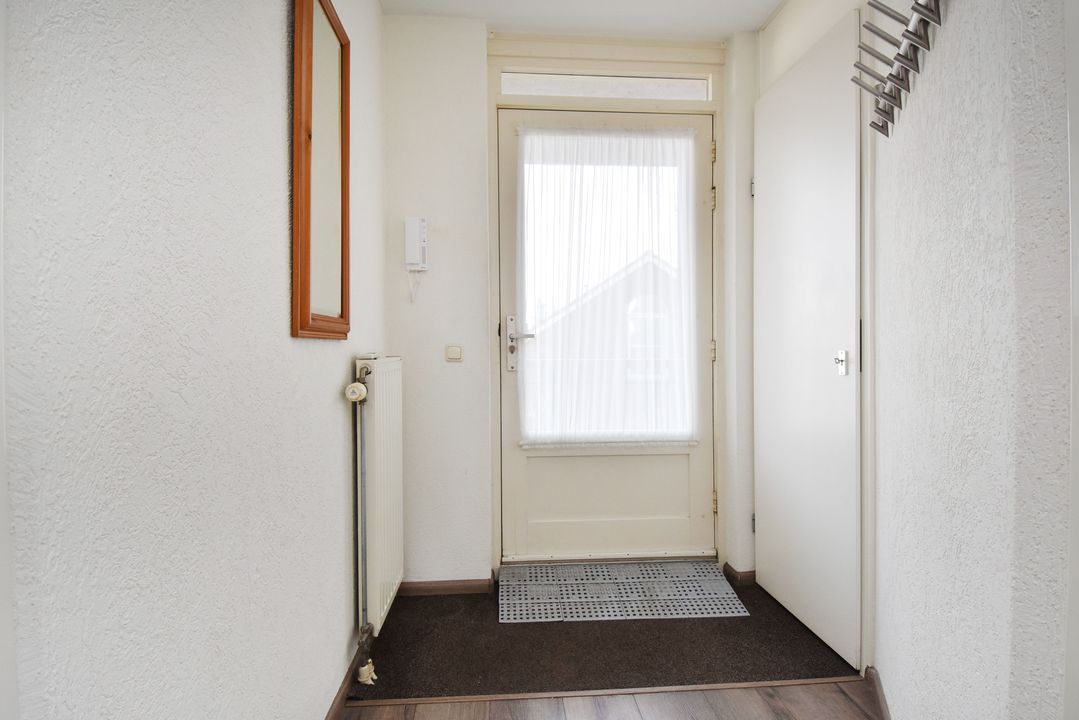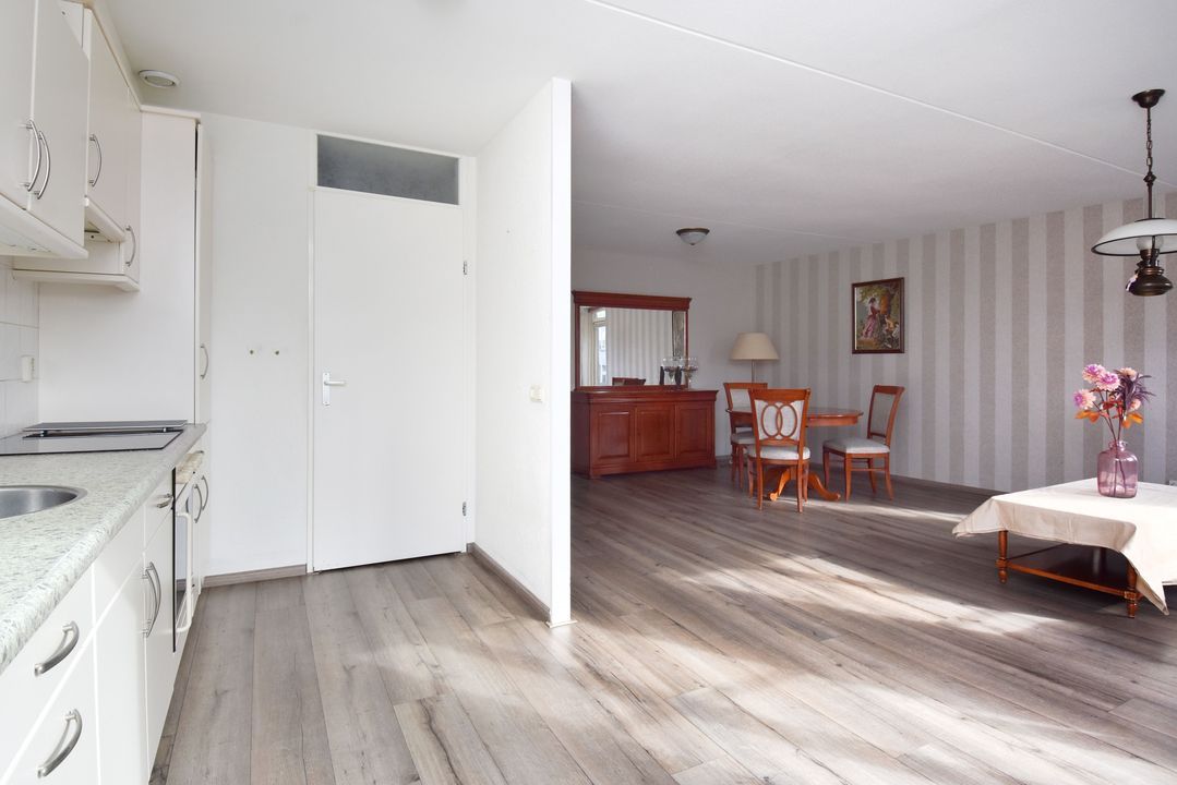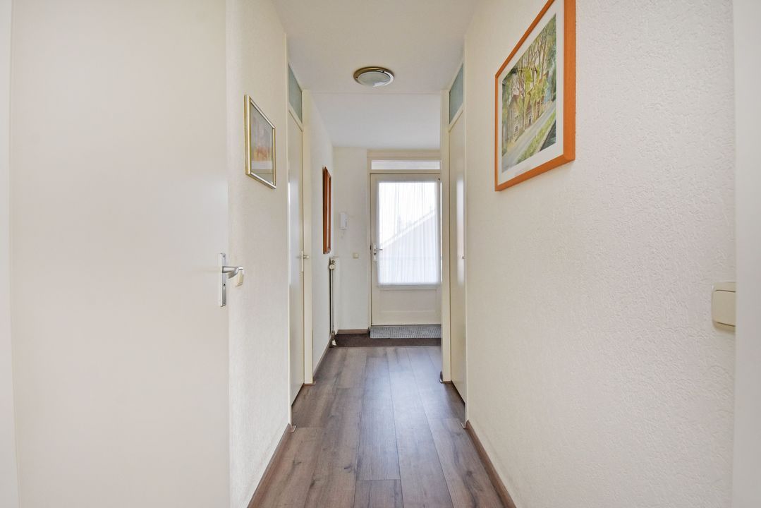Entree, hal en een gezellige, lichte woonkamer met veel natuurlijke lichtinval dankzij de grote raampartijen. De gehele verdieping is voorzien van een moderne PVC-vloer.