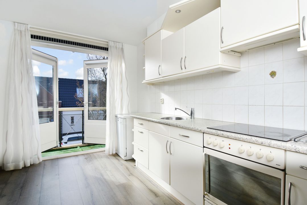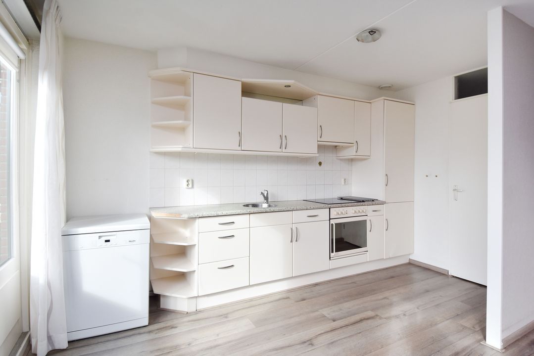 De keuken is praktisch ingericht. Daarnaast is er een aparte kast met opstelplaats voor de wasmachine en droger. De Vaillant cv-ketel is geplaatst in circa 2011.