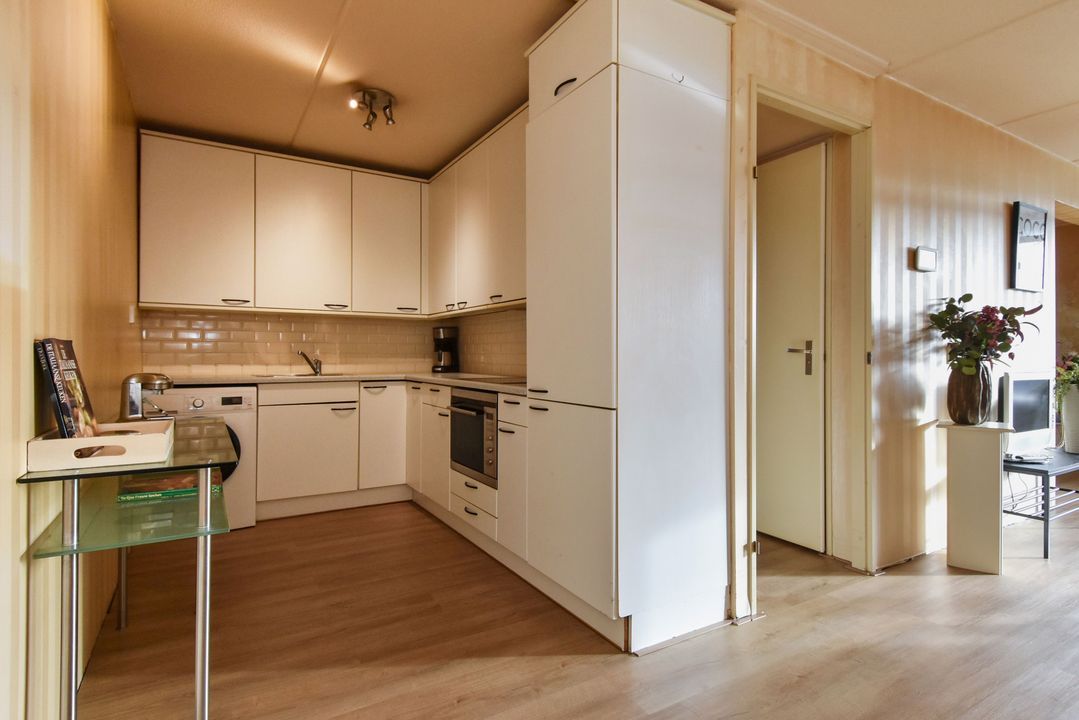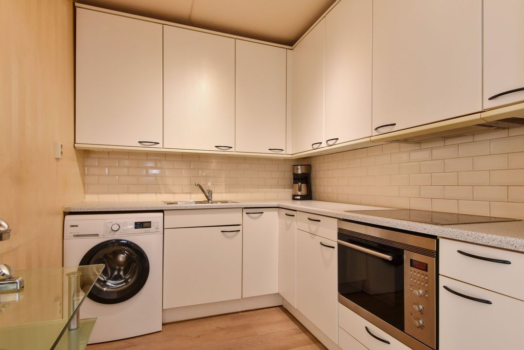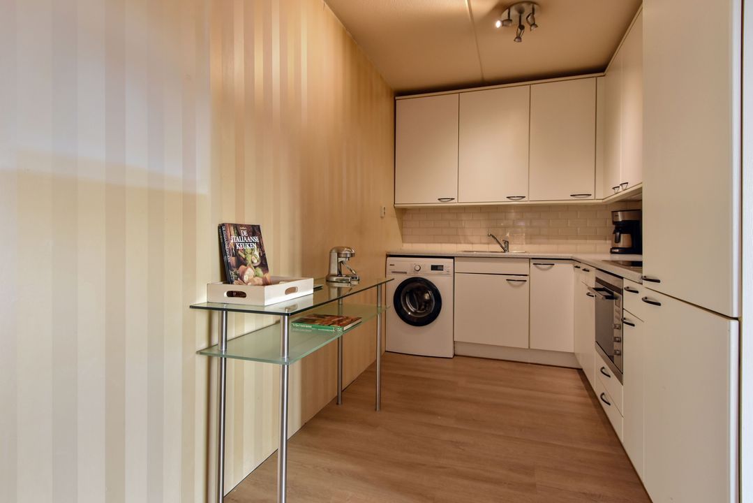 De halfopen keuken is praktisch ingedeeld en uitgevoerd in een lichte kleurstelling. De keuken beschikt over een inductiekookplaat, koelkast, veel kastruimte en een wasmachineaansluiting.