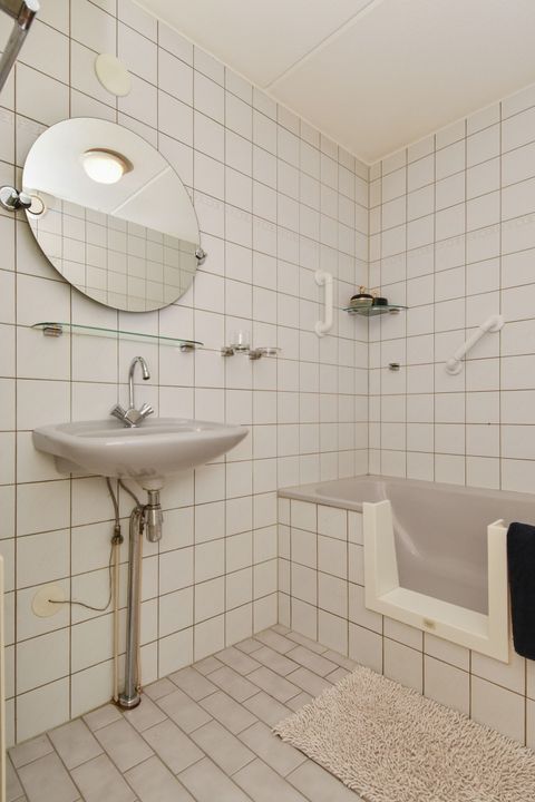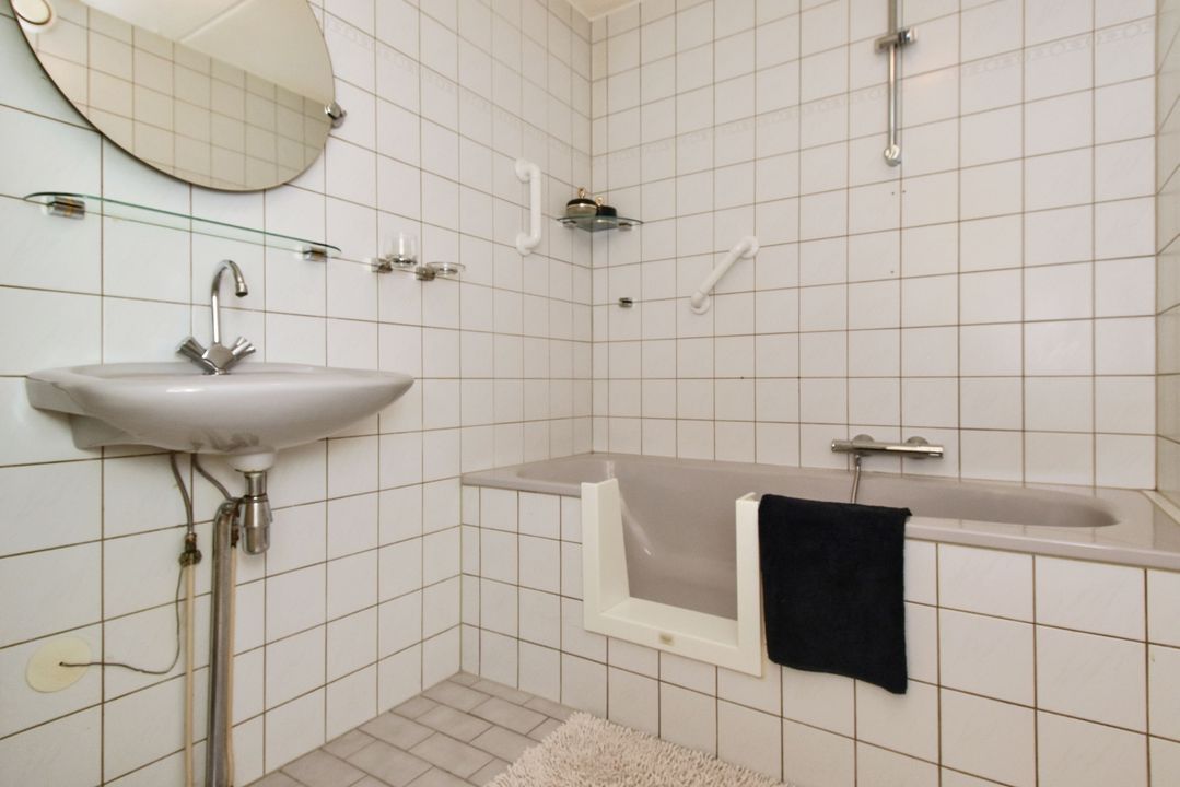 De royale badkamer is volledig betegeld en uitgerust met een ligbad, wastafel en spiegel. Daarnaast is er een separaat toilet, eveneens geheel betegeld.