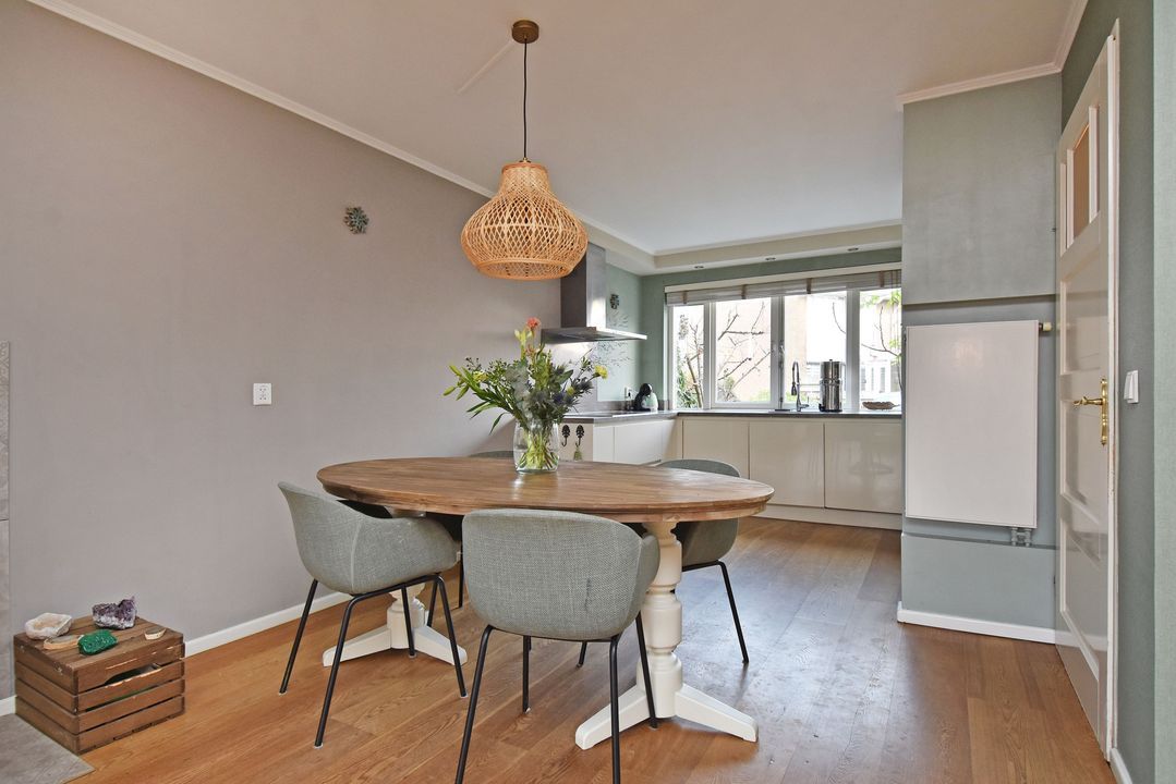 De prachtige duo planken vloer loopt door over de gehele begane grond en onder de trap bevindt zich een praktische vaste kast.