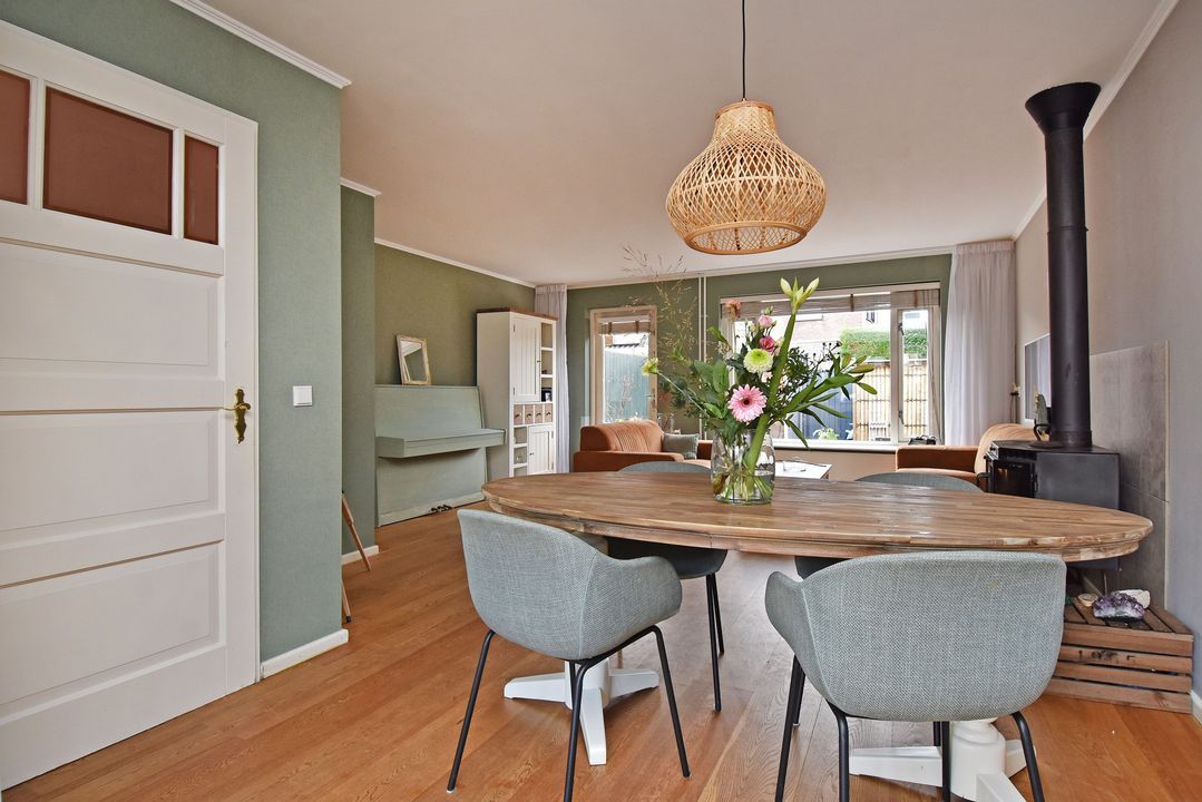 U komt binnen in de ruime hal met het toilet met fonteintje en de vernieuwde meterkast. Vervolgens loopt u door naar de lichte keuken, die is uitgerust met een inductiekookplaat, vaatwasser, koelkast, vriezer en een oven. De keuken en de woonkamer hebben een strak gestuct plafond en in de woonkamer zorgt de houtkachel voor extra sfeer en warmte.