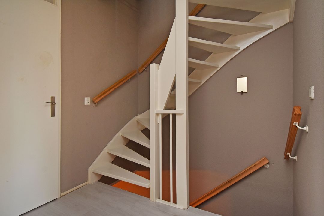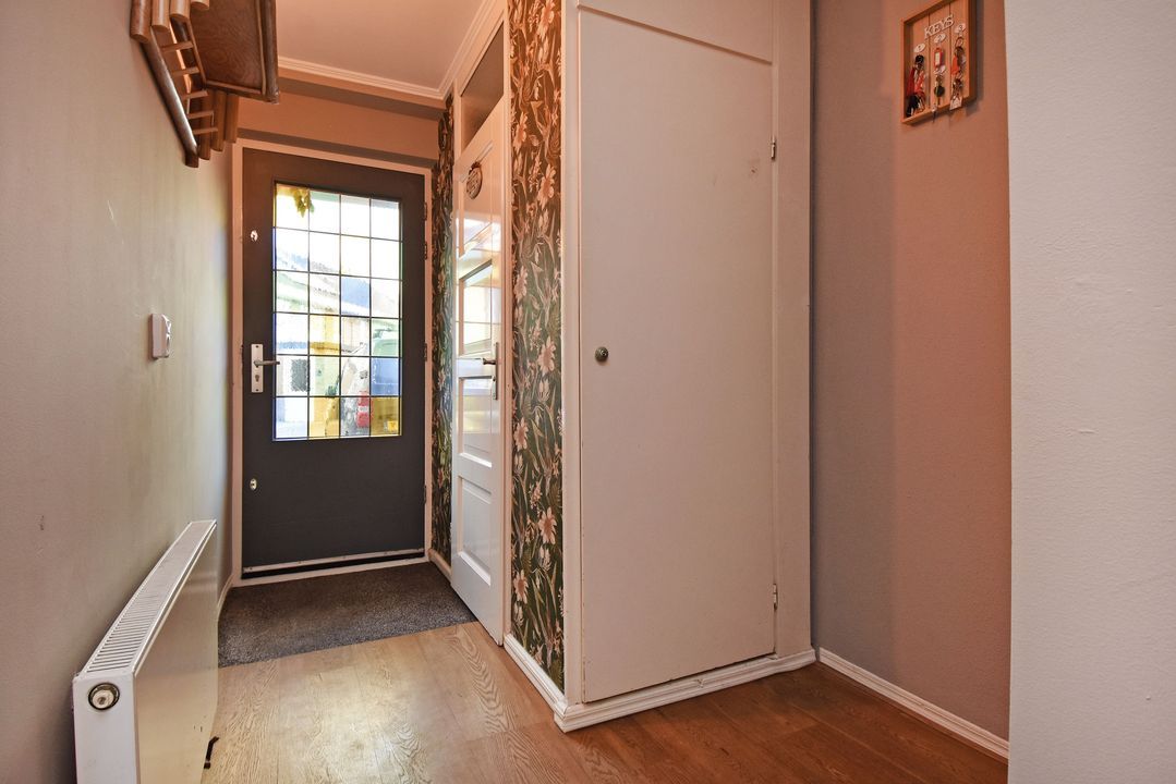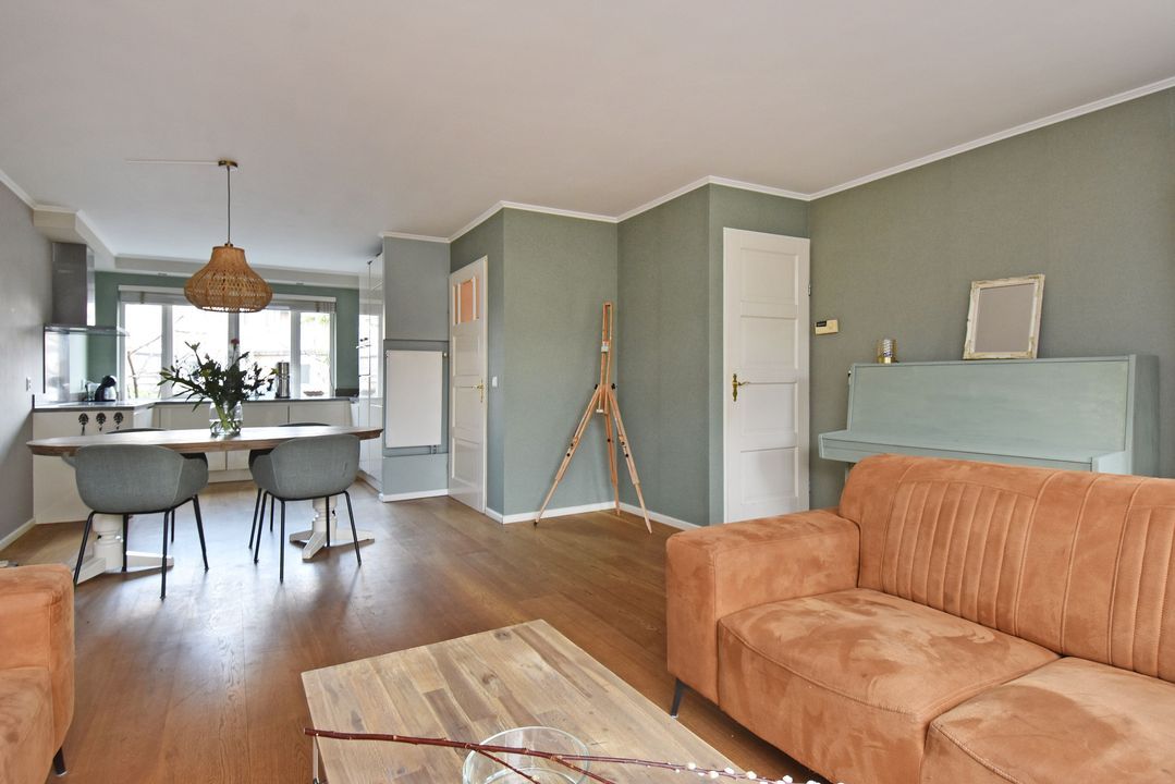 De prachtige duo planken vloer loopt door over de gehele begane grond en onder de trap bevindt zich een praktische vaste kast.