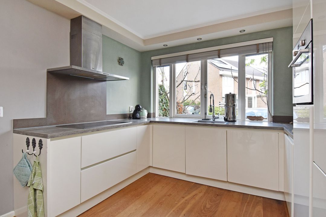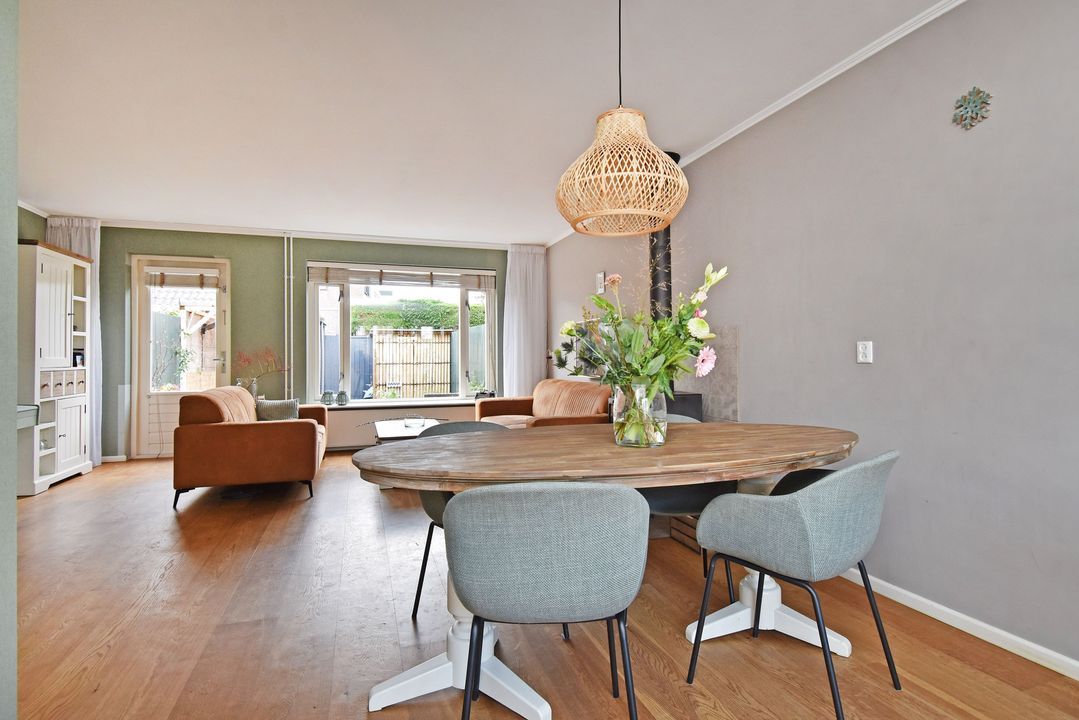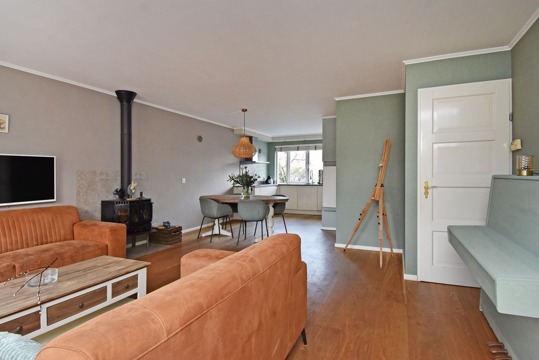 U komt binnen in de ruime hal met het toilet met fonteintje en de vernieuwde meterkast. Vervolgens loopt u door naar de lichte keuken, die is uitgerust met een inductiekookplaat, vaatwasser, koelkast, vriezer en een oven. De keuken en de woonkamer hebben een strak gestuct plafond en in de woonkamer zorgt de houtkachel voor extra sfeer en warmte.