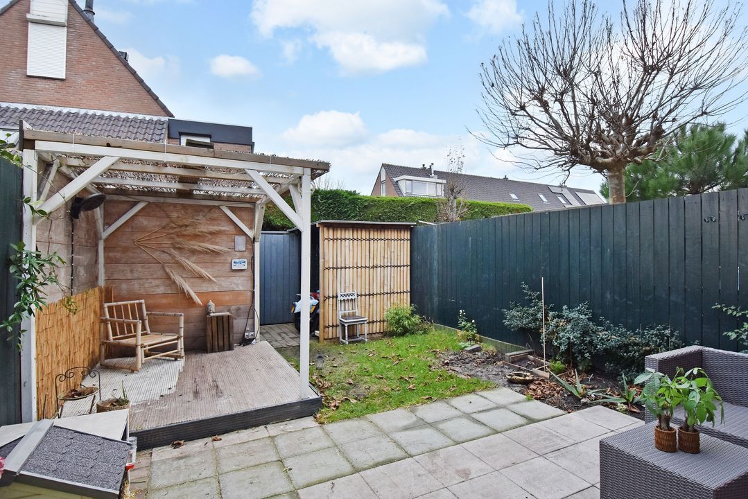 De zonnige achtertuin is gelegen op het zuidwesten, waardoor u hier vrijwel de hele dag van de zon kunt genieten. Achterin de tuin staat een stenen berging met elektra, met daaraan vast een gezellige veranda. De tuin beschikt verder over een achterom, buitenkraan en zonwering.