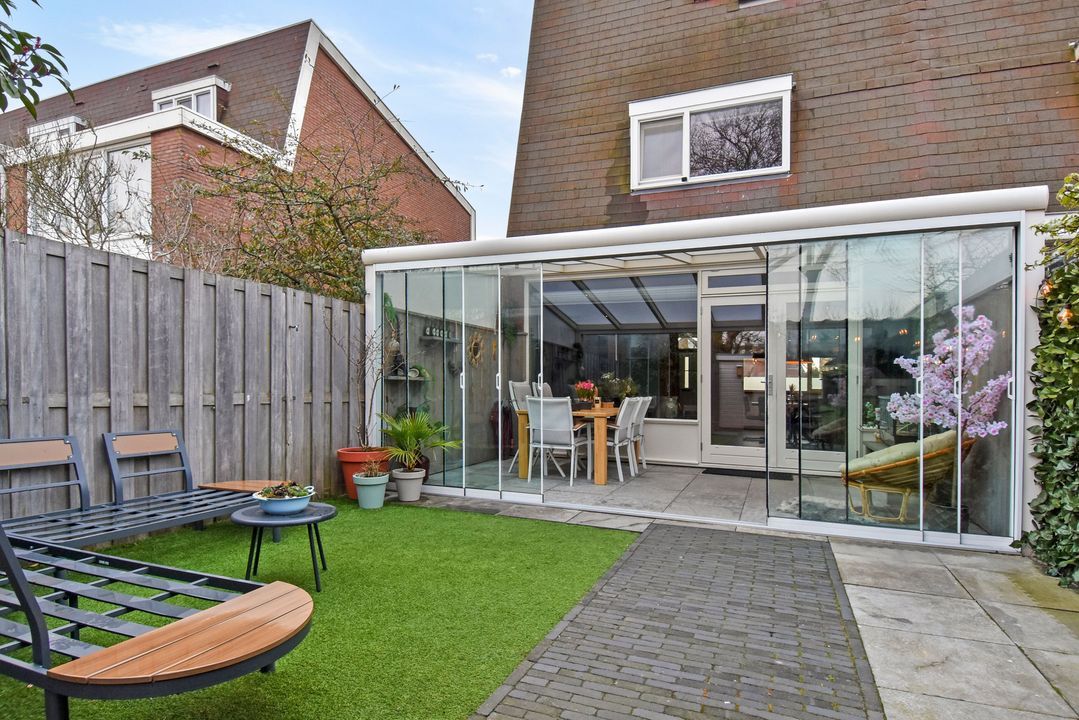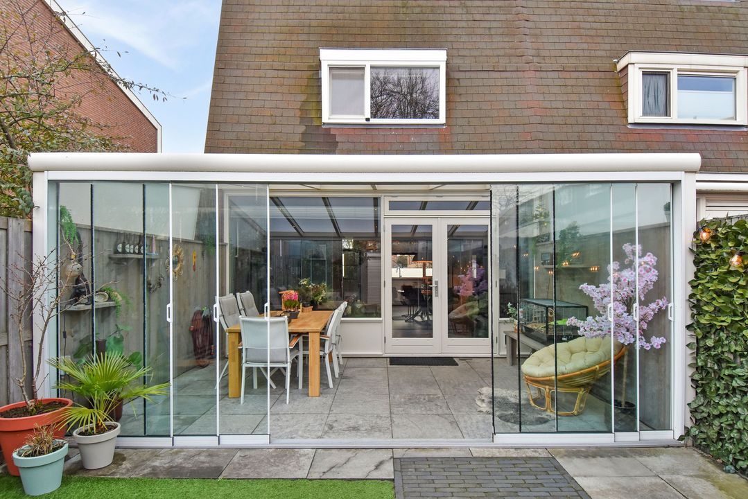 De sfeervolle woonkamer is voorzien van een hoogwaardige pvc-vloer met vloerverwarming en een stijlvolle nieuwe stalen deur met magneetsluiting. De lichte serre met LED-verlichting en glazen pui vormt een prachtige verlenging van de woonkamer en biedt direct toegang tot de zonnige achtertuin op het zuidwesten — hier geniet u volop van de middag- en avondzon.
