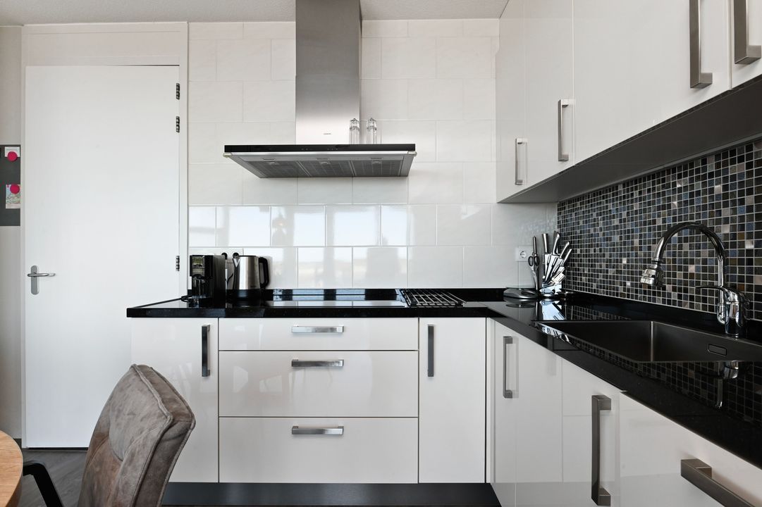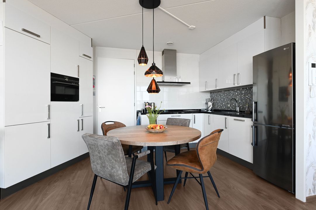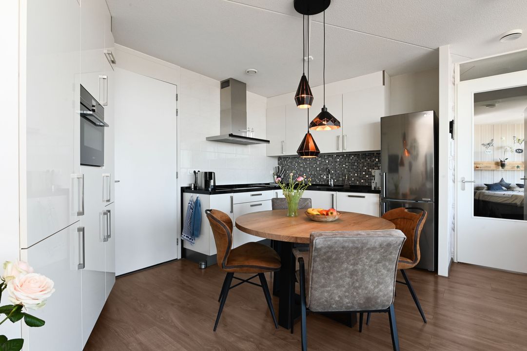 De open, luxe keuken (ca. 10 jaar oud) is uitgevoerd met een stijlvol granieten werkblad en voorzien van diverse inbouwapparatuur zoals een inductiekookplaat, vaatwasser en een combi oven/magnetron met periflex aansluiting. Daarnaast is er een losse koel-/vriescombinatie aanwezig. Aansluitend bevindt zich een praktische bijkeuken met veel bergruimte en de opstelling van de Remeha Calenta cv-ketel en de pomp van de vloerverwarming WTW-installatie (filters vernieuwd in september 2025)