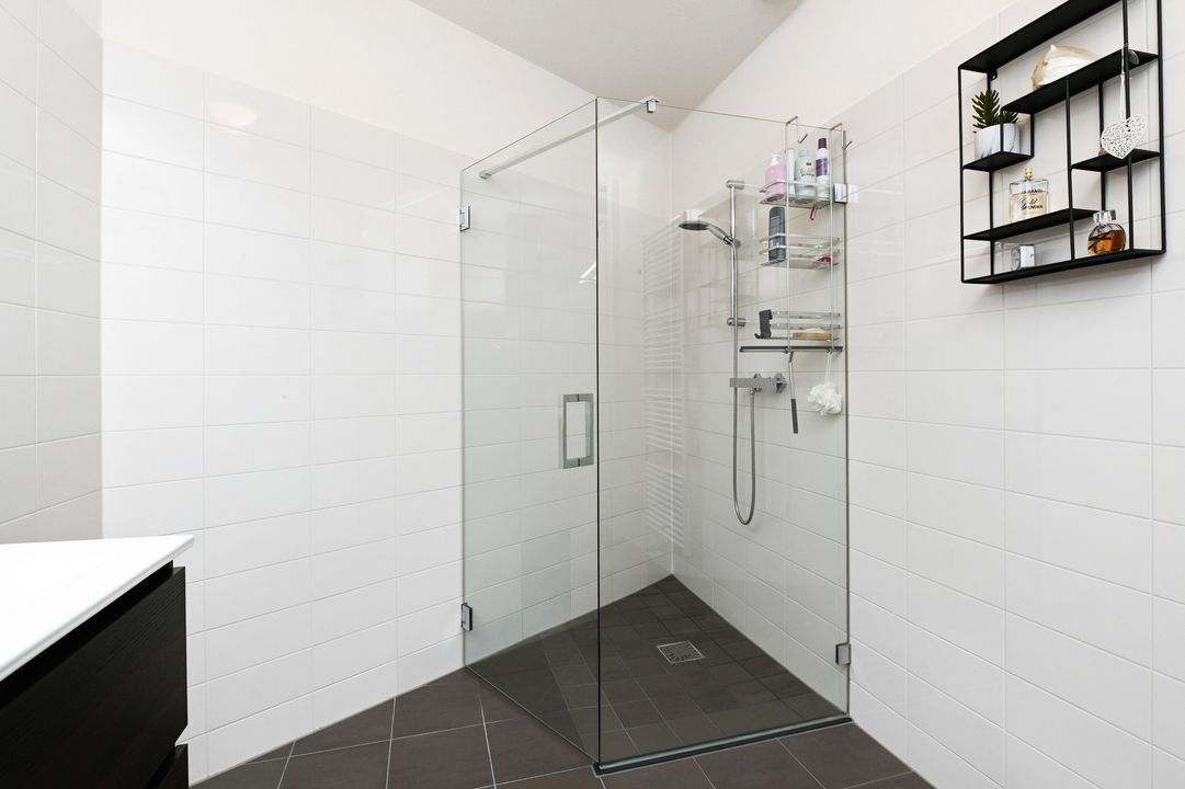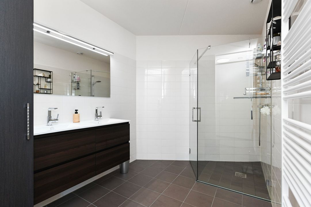 De moderne badkamer is compleet uitgevoerd met een glazen inloopdouche, dubbele wastafel, verwarmde spiegel, designradiator en een handige opbergkast.