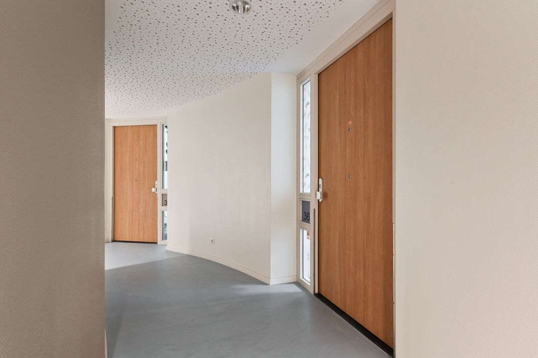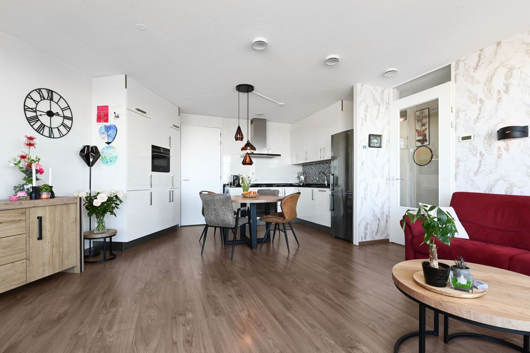 De lichte en sfeervolle woonkamer (ca. 22,5 m²) is strak afgewerkt met recent behang en schilderwerk (ca. 3 jaar oud) en beschikt over grote raampartijen van vloer tot plafond met kantel-kiepramen. Vanuit zowel de woonkamer als de slaapkamer heeft u direct toegang tot het zonnige balkon.