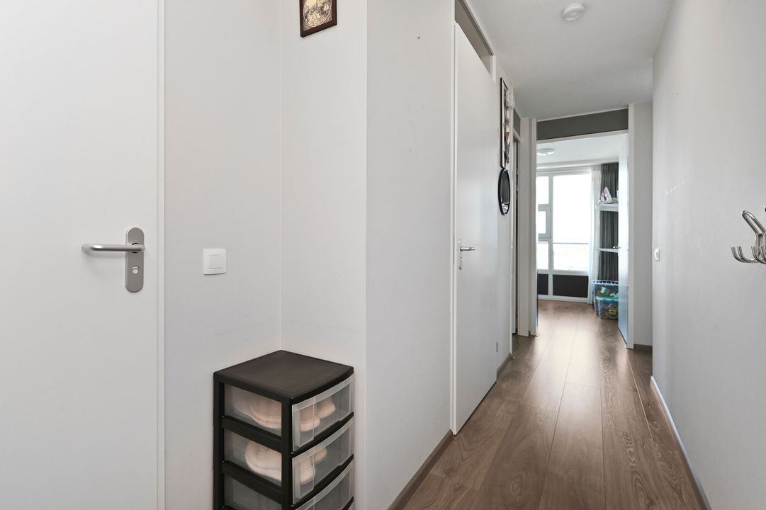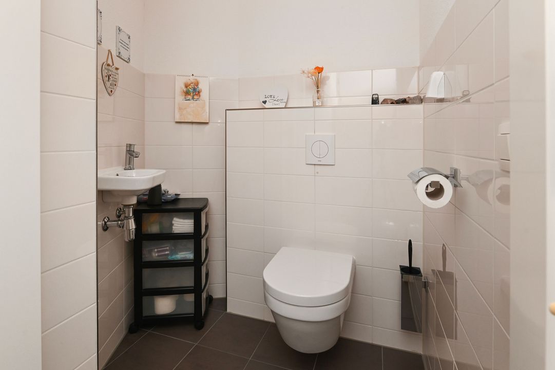 Bij binnenkomst treft u een ruime hal met meterkast en een modern, separaat toilet (Villeroy & Boch, half betegeld, met fonteintje). Het gehele appartement is voorzien van een fraaie laminaatvloer in combinatie met comfortabele vloerverwarming.