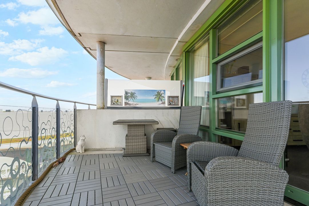 Het royale balkon van ca. 24 m² op het westen biedt volop ruimte om te ontspannen en te genieten van de zon.