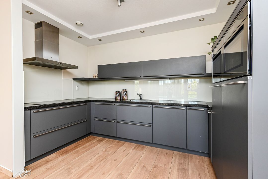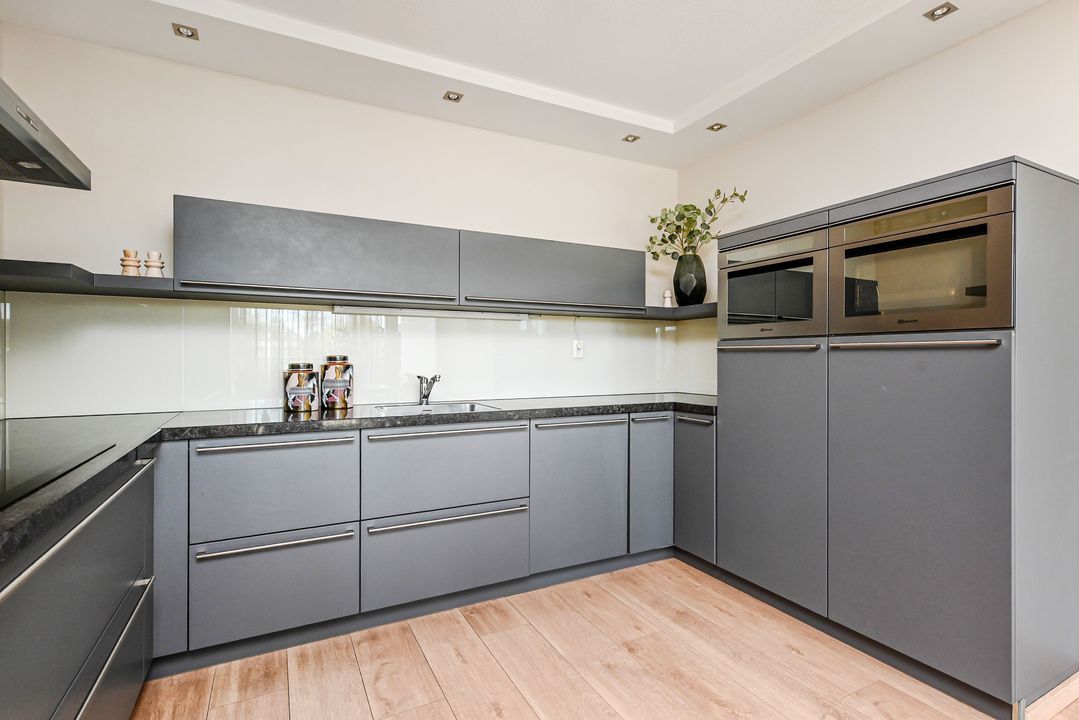 De luxe open keuken in U-opstelling heeft een moderne, donkergrijze afwerking met een stijlvol zwart composiet werkblad. De keuken is volledig uitgerust met hoogwaardige inbouwapparatuur zoals een vaatwasser, inductiekookplaat met afzuigkap, koelkast, vriezer, oven en een separate magnetron. Dankzij de vele lades en kastruimte én de ruime eethoek is dit een ideale plek voor kookliefhebbers en gezellig tafelen.