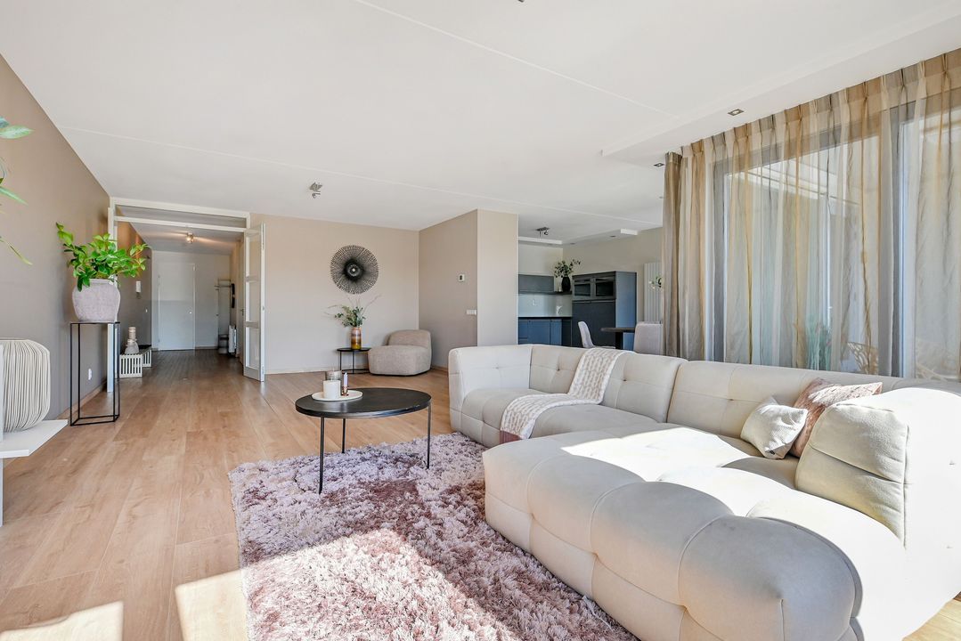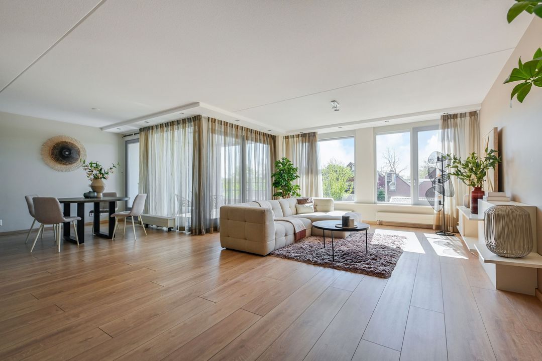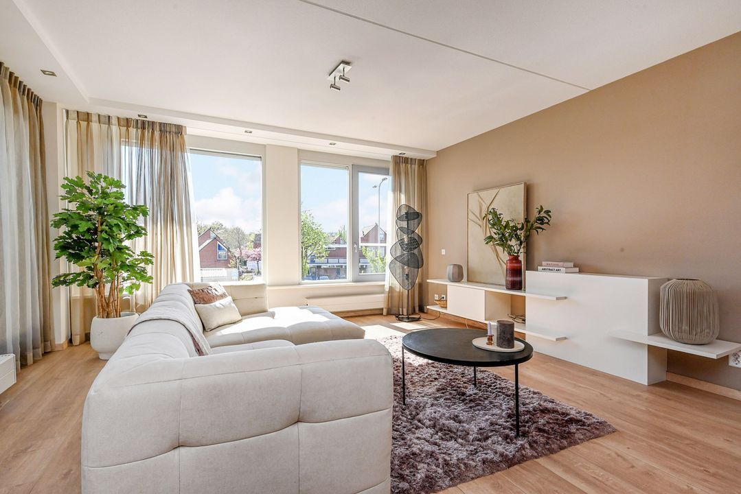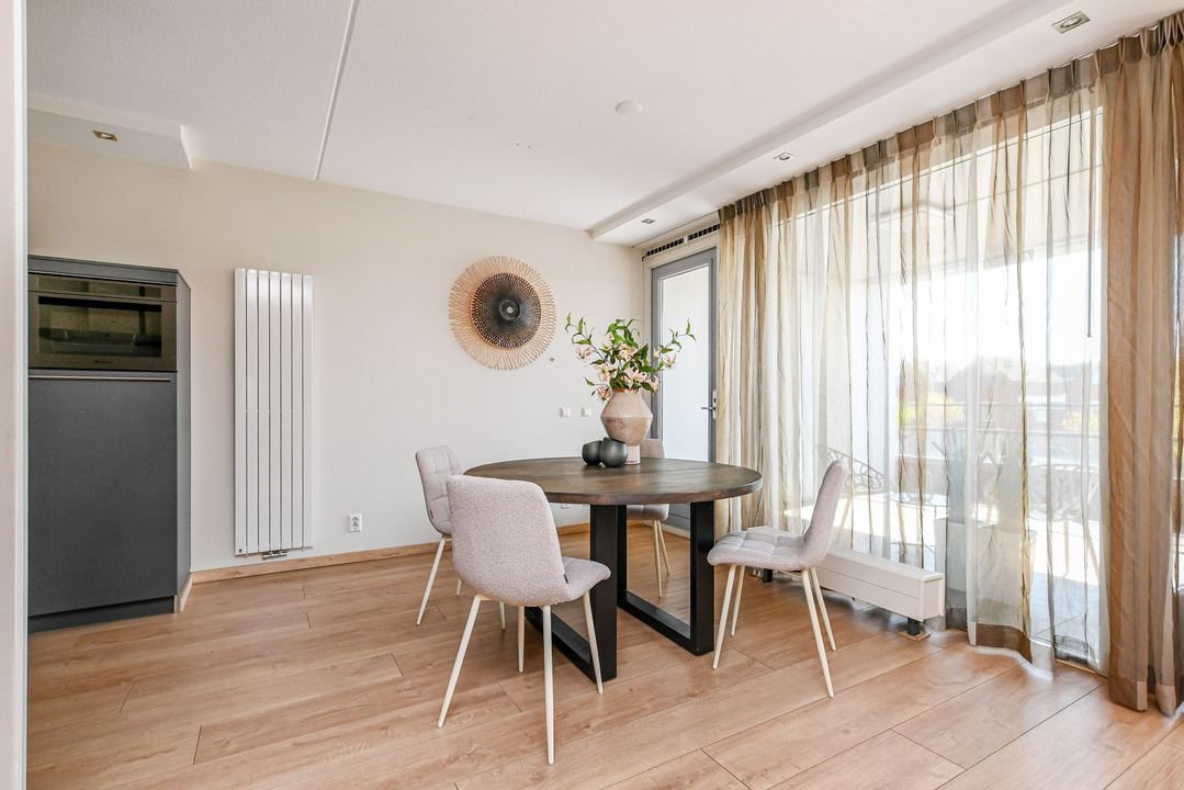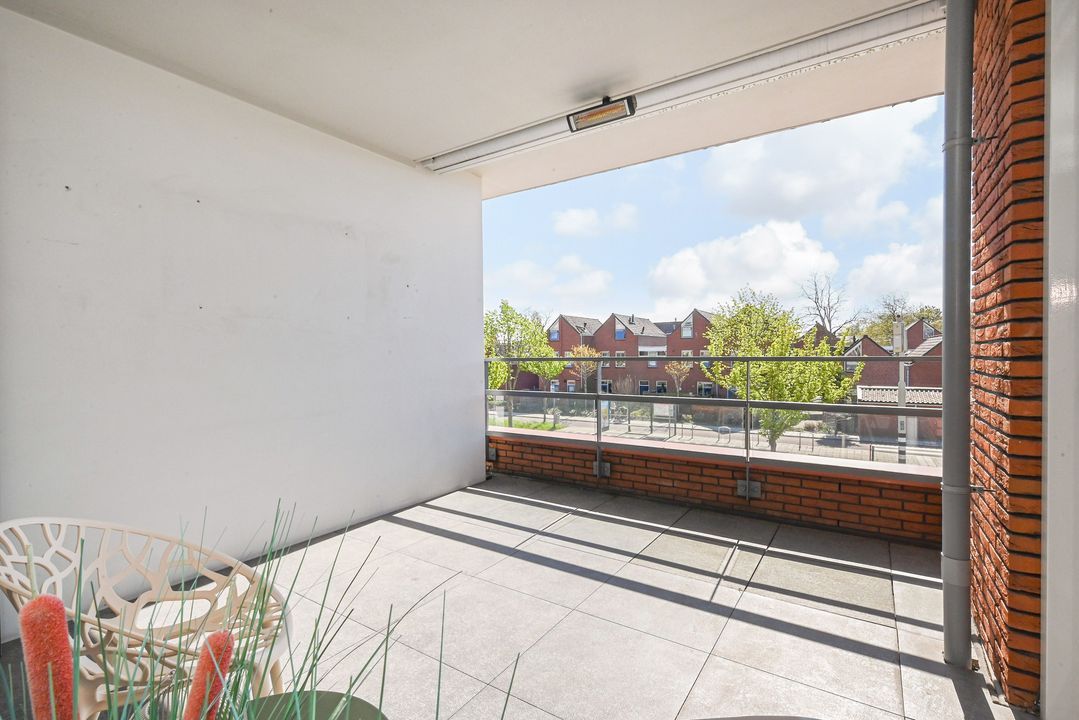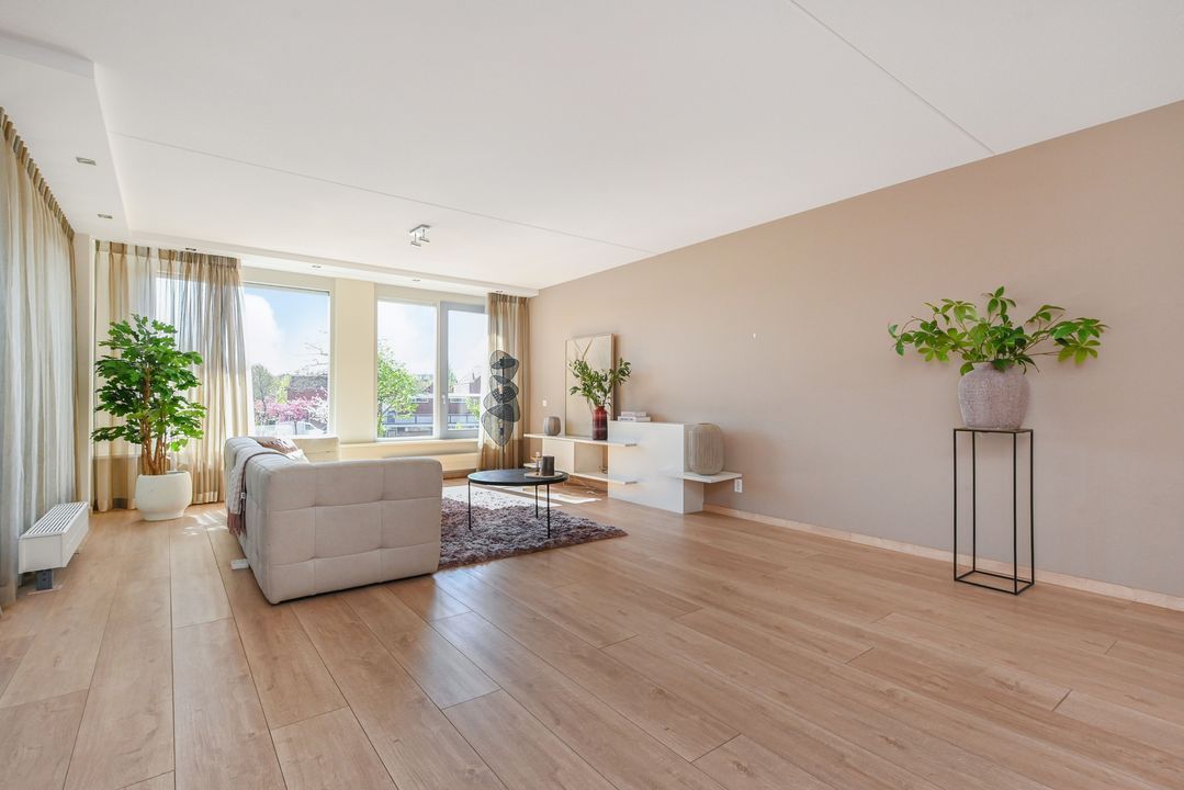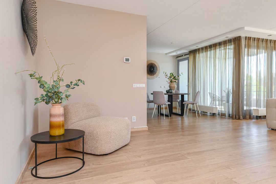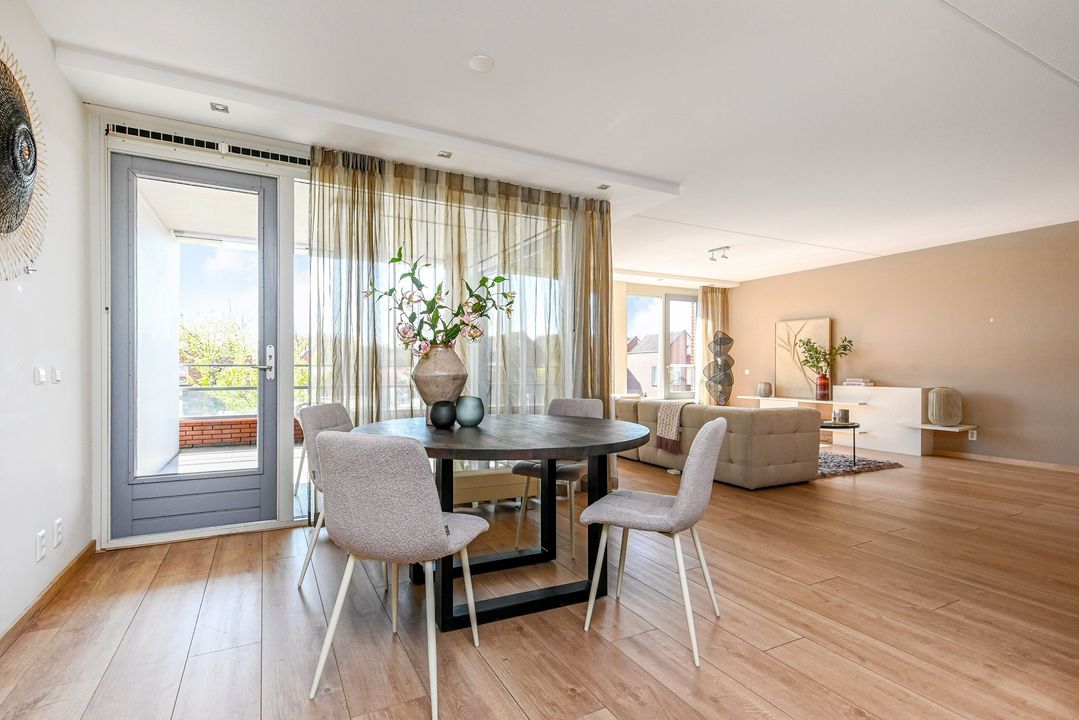 De zeer royale woonkamer is een echte eyecatcher: grote raampartijen zorgen voor een prachtige lichtinval en via de schuifpui bereik je het zonnige balkon. Dit balkon van ca. 15 m² is voorzien van antraciet tegels, zonwering en een terrasverwarmer – perfect om het hele jaar door te genieten.