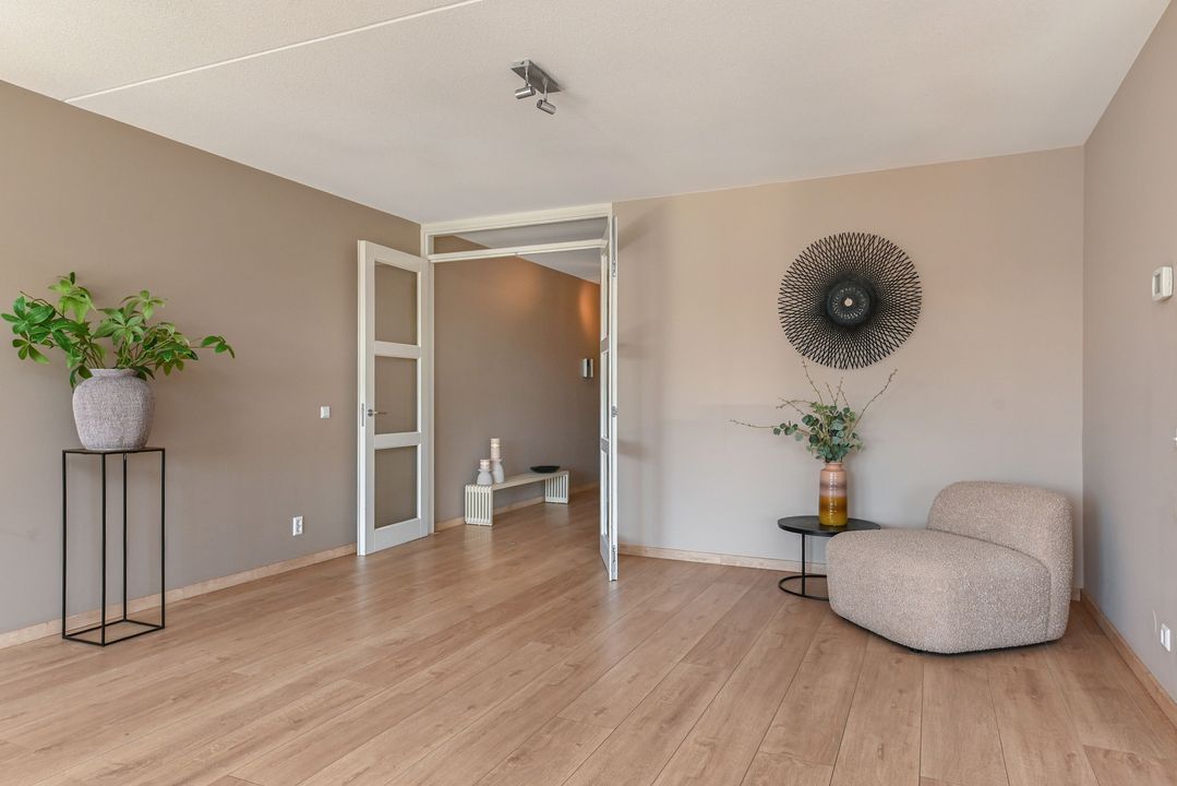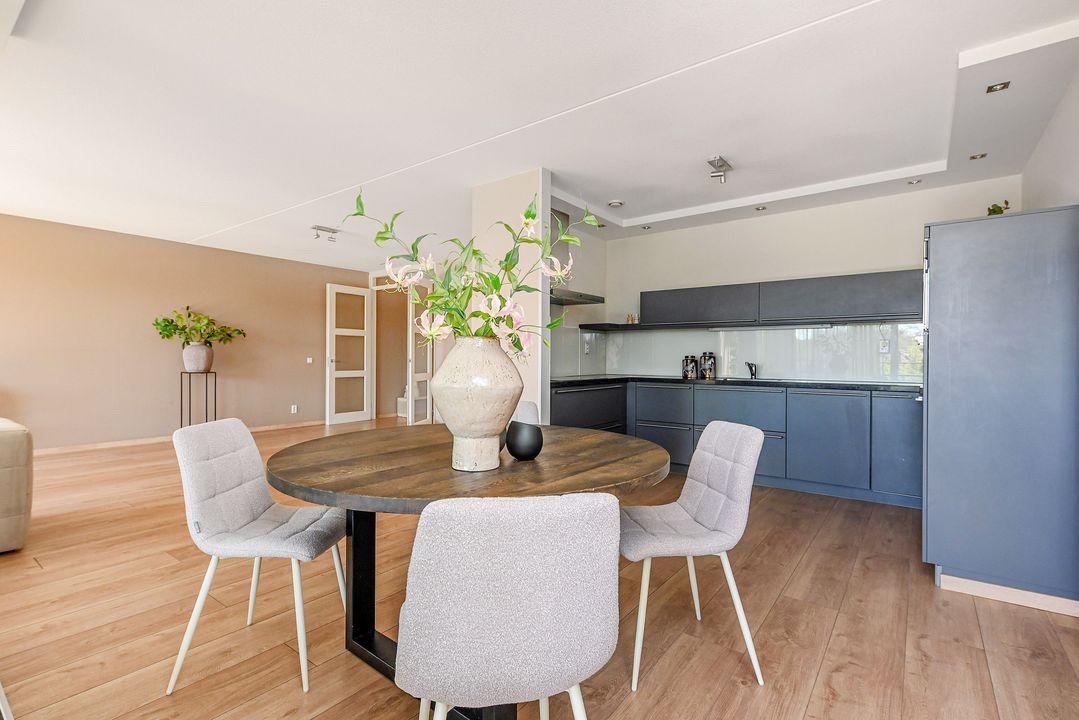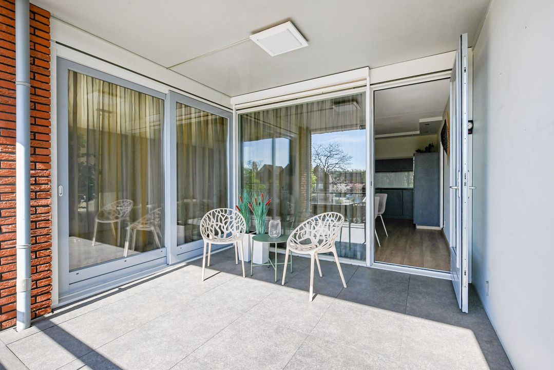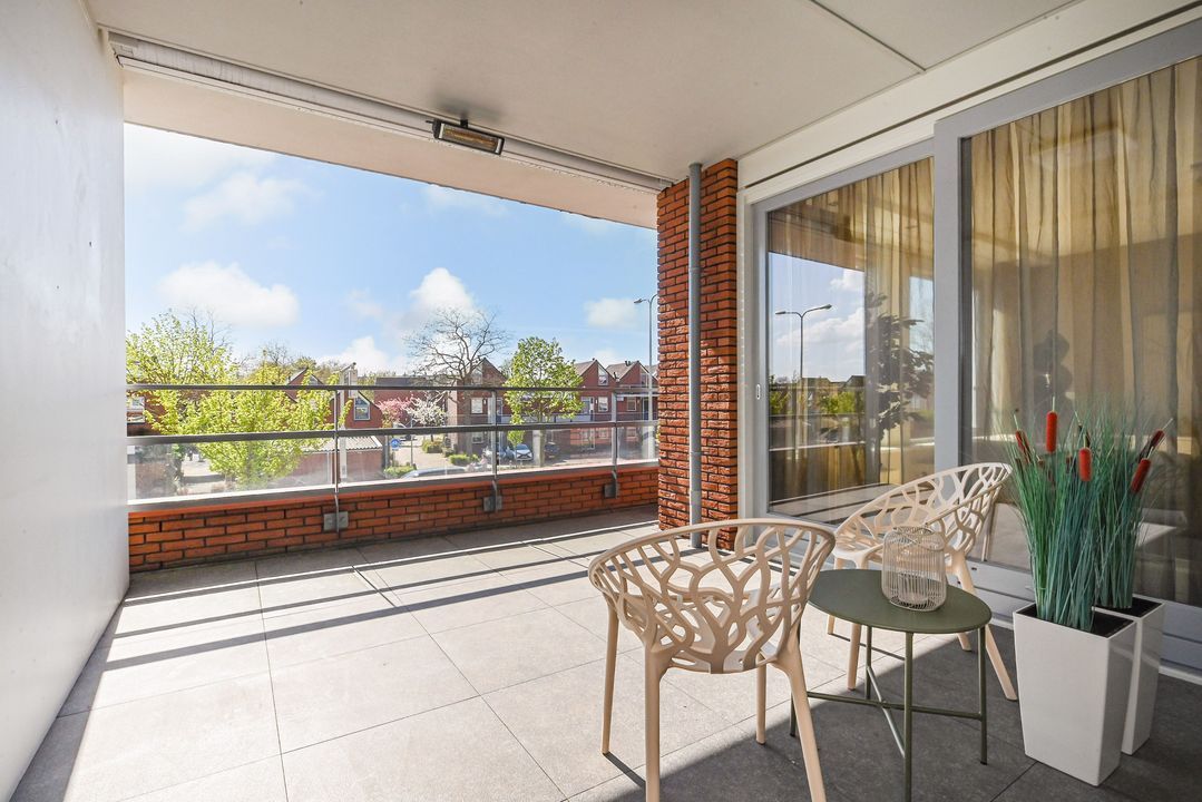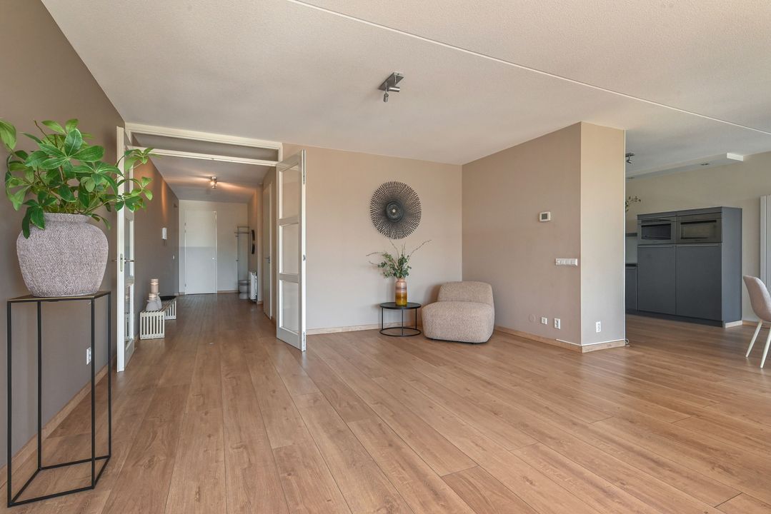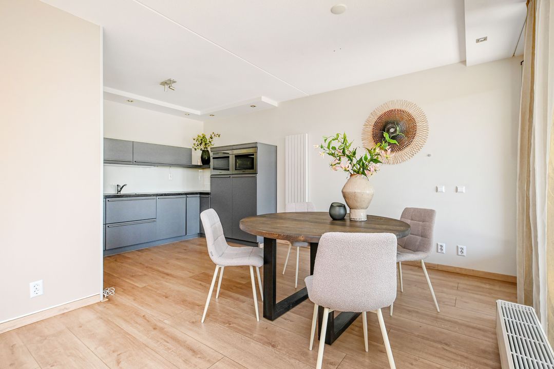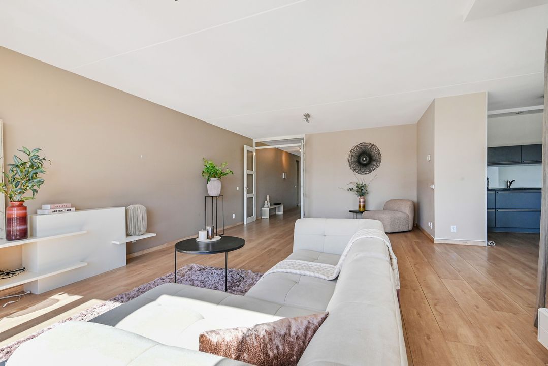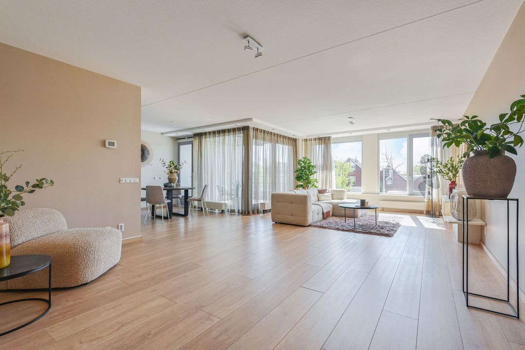 De zeer royale woonkamer is een echte eyecatcher: grote raampartijen zorgen voor een prachtige lichtinval en via de schuifpui bereik je het zonnige balkon. Dit balkon van ca. 15 m² is voorzien van antraciet tegels, zonwering en een terrasverwarmer – perfect om het hele jaar door te genieten.