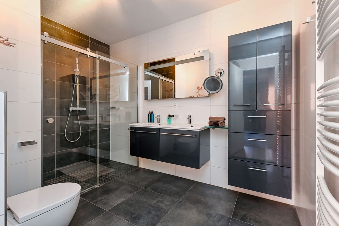 De luxe badkamer is modern afgewerkt met hoogwaardige wand- en vloertegels en voorzien van: